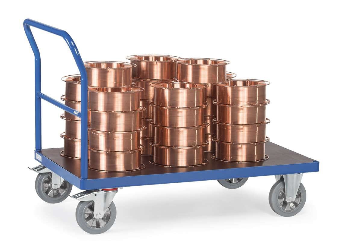 Ensemble mécano-soudé, revêtement époxy bleu RAL 5007 avec plate-forme en contreplaqué plastifié antidérapant et hydrofuge et dossier de poussée.Chariot spécialement conçu pour transporter des charges lourdes, les roues à bandage élastique sur jantes en aluminium avec moyeu à roulement à billes permettent un déplacement aisé et confortable.