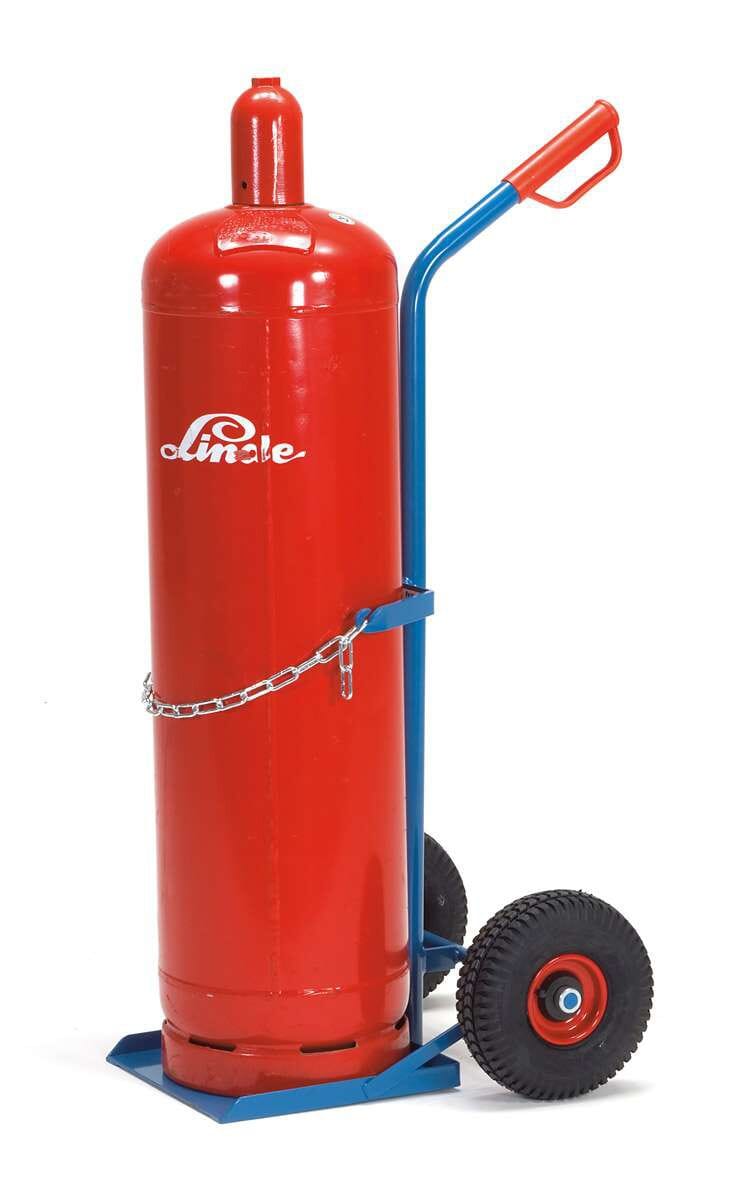 Tube acier soudé, revêtement époxy bleu RAL 5007.Diable porte-bouteilles avec chaîne de maintien.Pour 1 bouteille de propane de 10,40 ou 50 litresRoues à bandage caoutchouc ou gonflables, moyeu à roulement à rouleaux.