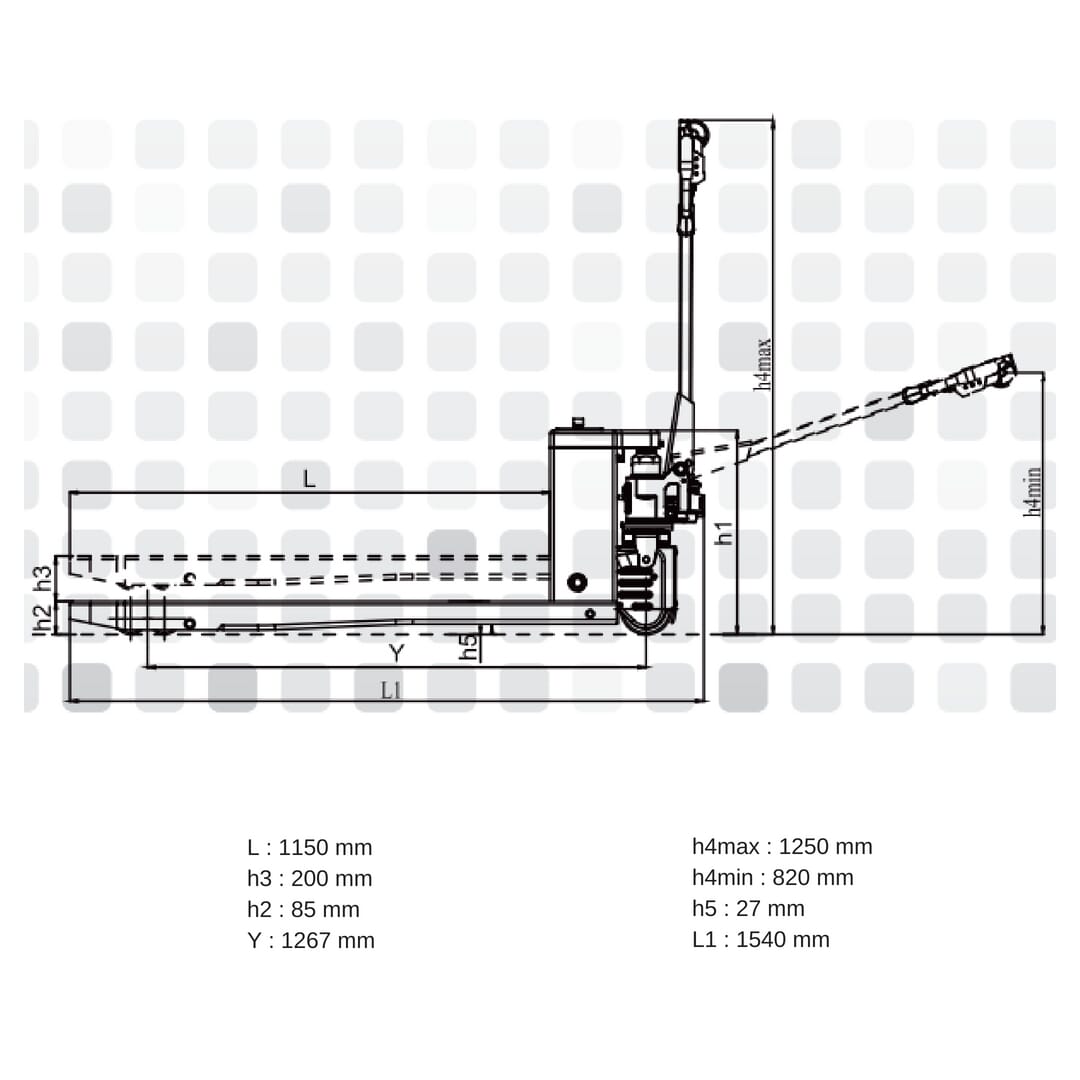 Ce transpalette semi-électrique permet de tranporter une charge maximale de 1500 kg avec une hauteur de levée de 85 à 200 mm. Avec son frein il s'arrête facilement et rapidement sur tous types de terrain. Son moteur permet de monter facilement les pentes et de se déplacer facilement sur les routes inégales. Il est équipé d' une batterie lithuim-ion de 24V/ 20 Ah, qui permet un temps de travail en continu de 4 à 5 heures, un temps de chargement de 5 heures et un temps de remplacement de seulement 6 secondes. Il est également équipé d'un indicateur de charge, d'un bouton d'arrêt d'urgence, d'un klaxon et d'un bras long pour réduire la fatigue avec un retour automatique à la verticale.