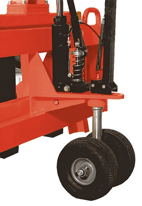 Équipé de pneus et de fourches réglables, ce transpalette peut s'utiliser sur tout type de terrain. Sa capacité de charge est de 1,2 tonnes.