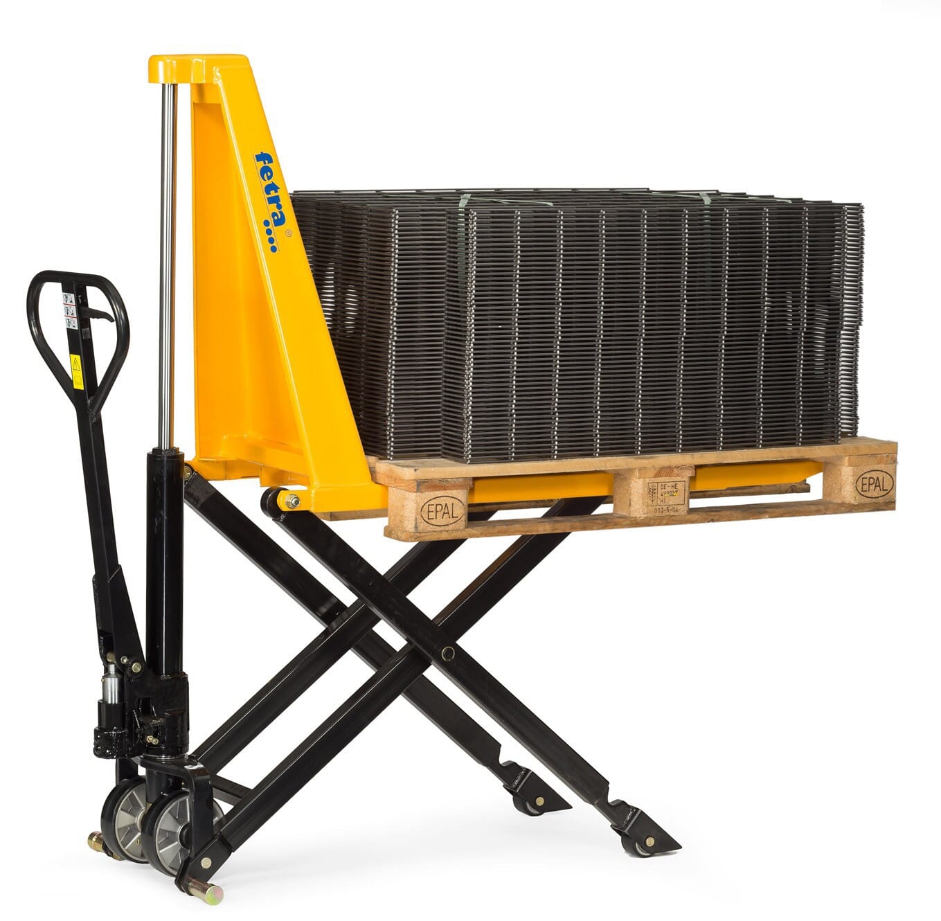 Transpalette à ciseaux grande levée avec des roues en caoutchouc.
